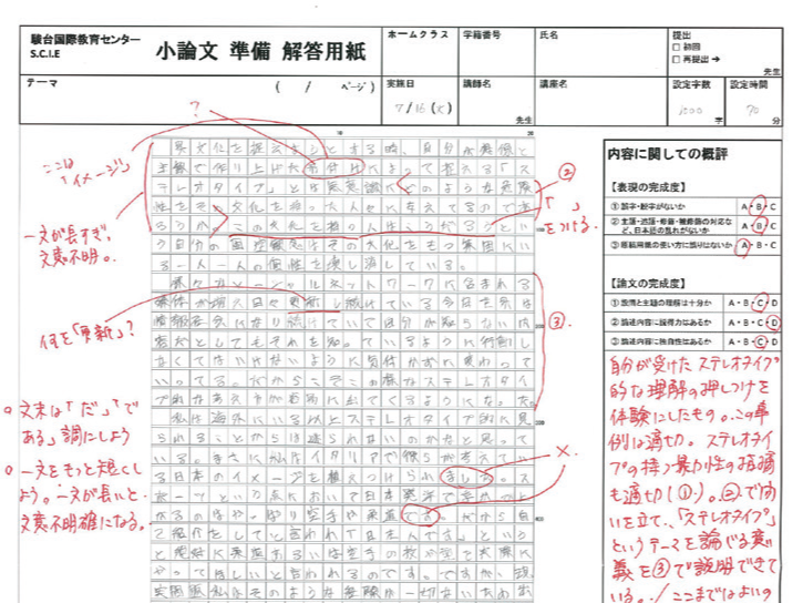 原稿用紙の使い方から作文と小論文の違い、意見を論ずるための3要素「問い、答え、論証」などの基本事項を教授します。また、現代の諸問題について客観的に分析する力を養い、自分の意見をしっかり述べることができるように指導します。